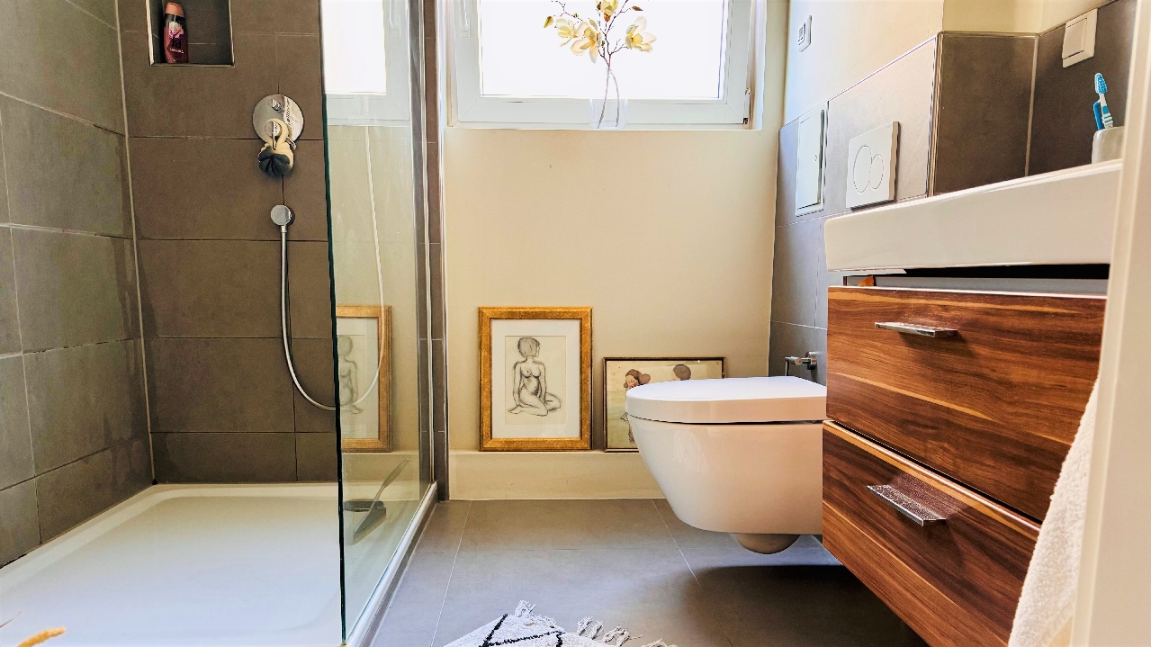 Das Tageslichtbad ist modern und großzügig, mit Fußbodenheizung und einer bodengleichen Dusche mit viel Bewegungsfreiheit.