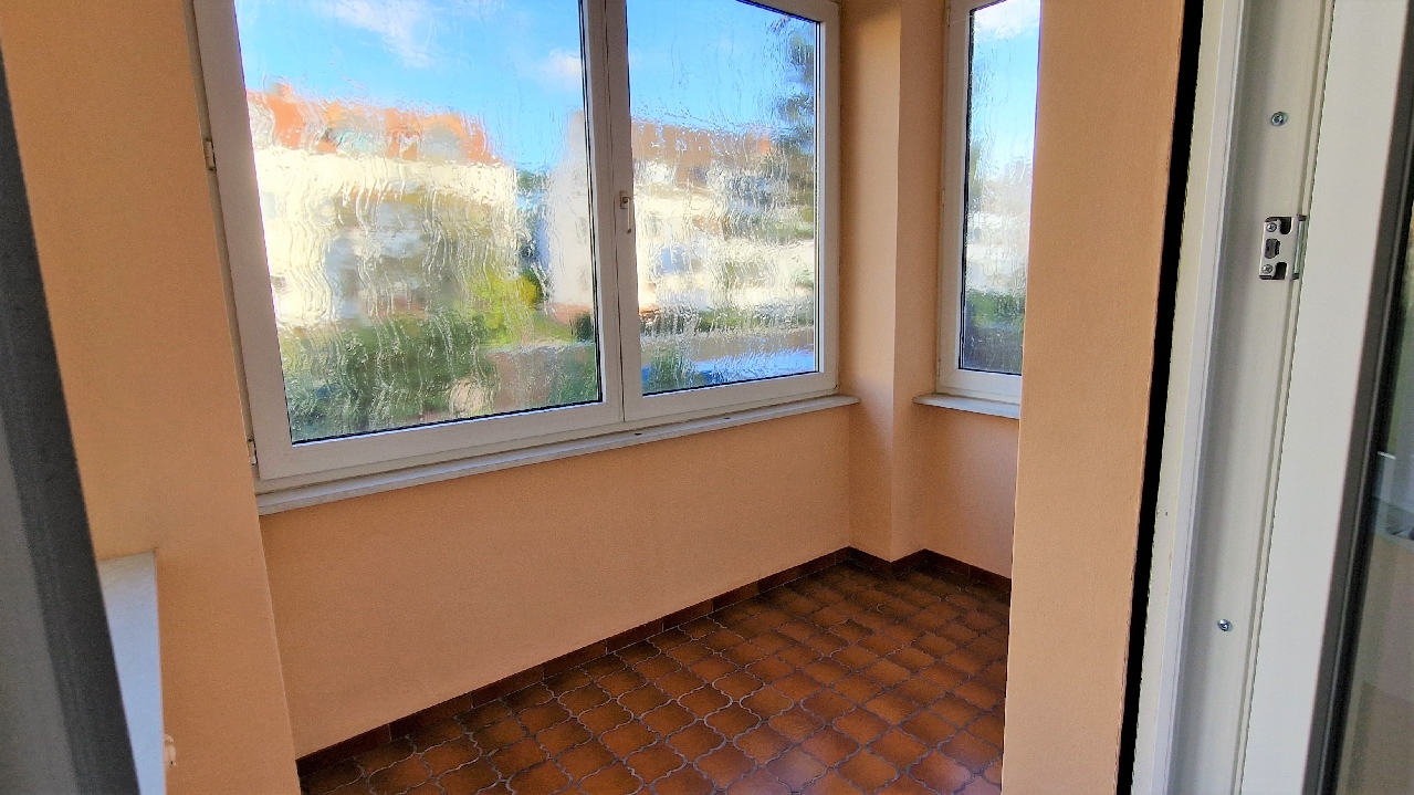 Klassischer Grundriss dieser Baujahre: Alle Räume sind etwa gleich groß, auch die Wohnküche. Von hier und dem Raum daneben gibt es je einen Zugang zum verglasten Balkon auf der Gartenseite. Im Sommer sind die Fenster davon großzügig zu öffnen. Die beiden Räume auf der Südseite haben einen großen Durchgang.