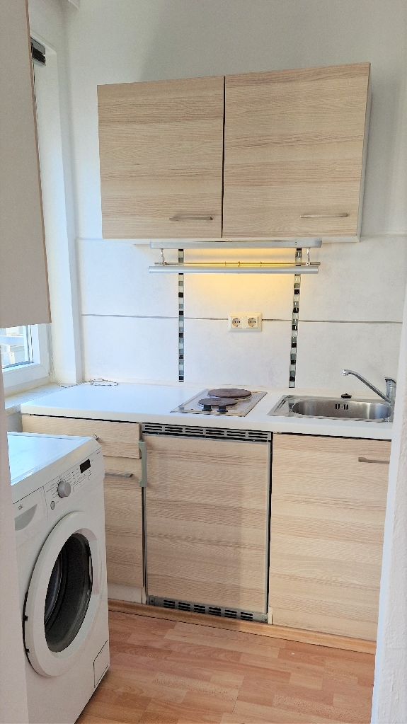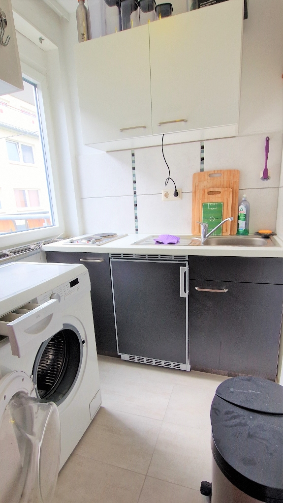Die Küche mit Einbauküche und Waschmaschine ist klein, aber ein separater Raum.